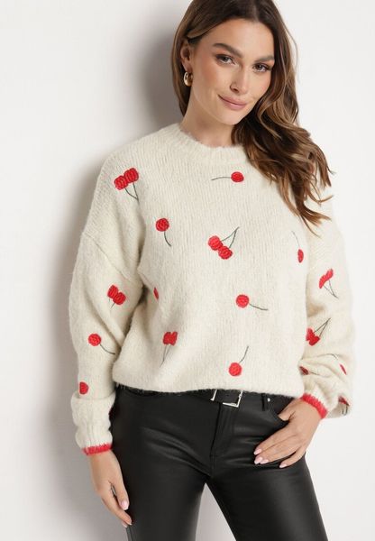 Jasnobeżowy Sweter z Domieszką Wełny z Motywem Wisienek Sintovia