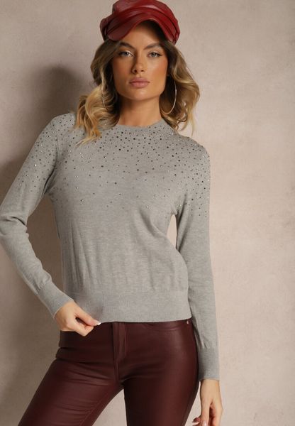 Szary Casualowy Sweter z Wiskozą z Ozdobnymi Detalami z Cyrkonii Edaloriae