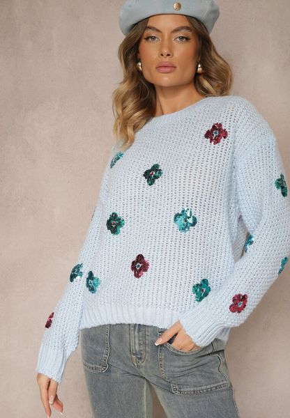 Jasnoniebieski Sweter z Wiskozą Zdobiony Cekinowymi Aplikacjami z Kwiatami Edalora