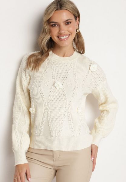 Jasnobeżowy Sweter z Bawełną Perłami i Kwiatami 3D Noraviela