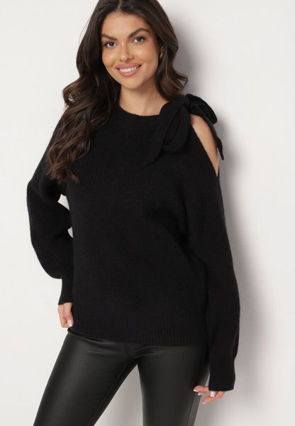 Czarny Sweter Ozdobiony Kokardą i Wycięciem Noredi