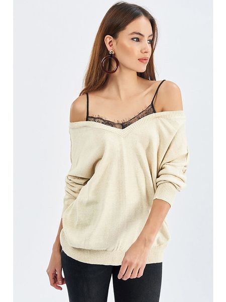 – dekolt: Carmen- ściągacz: dekolt, zakończenia rękawów, dolny brzeg- detale: koronka- krój: luźny- look: jednokolorowy