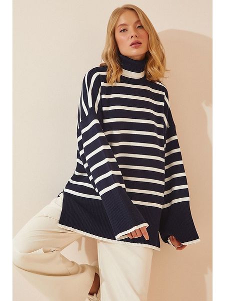 – kołnierz: golf- ściągacz: kołnierz, zakończenia rękawów, dolny brzeg- krój rękawów: nietoperz- krój: oversized- wzór splotu: ścisły- dolny brzeg: z rozcięciem- wzór: paski
