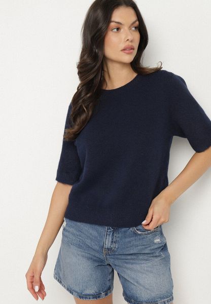 Granatowy Sweter z Wełną i Krótkim Rękawem Turosa