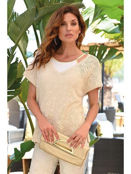 – dekolt: V- krój: luźny- wzór: dziurkowanyWskazówka: Na metkach odzieży tej marki znajdują się rozmiary francuskie. Rozmiarówka została przez nas przeliczona. Podane do wyboru warianty rozmiarów odpowiadają standardowym europejskim rozmiarom konfekcji. Prosimy zapoznać się z zamieszczonym objaśnieniem rozmiarów: