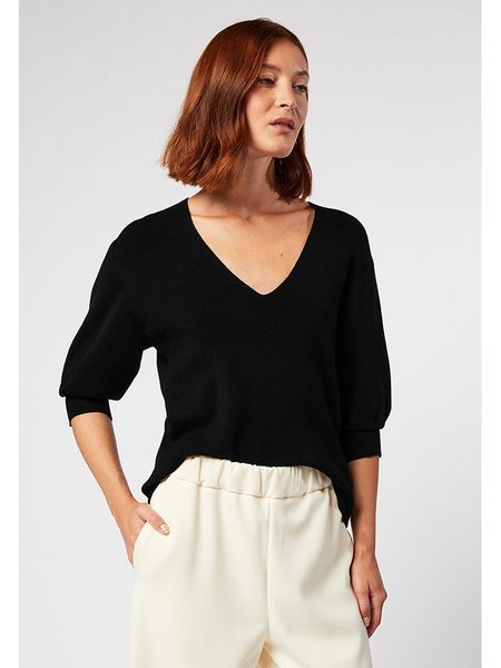 – z dodatkiem wełny- dekolt: V- krój: luźny- look: jednokolorowyUwaga: Na metkach odzieży tej marki znajdują się rozmiary francuskie. Rozmiarówka została przez nas przeliczona. Podane do wyboru warianty rozmiarów odpowiadają standardowym europejskim rozmiarom konfekcji. Prosimy zapoznać się z zamieszczonym objaśnieniem rozmiarów.