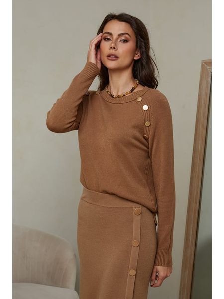 – dekolt: okrągły- ściągacz: dekolt, zakończenia rękawów, dolny brzeg- krój: prosty- wzór splotu: ścisły- detale: ozdobne guziki- look: jednokolorowy