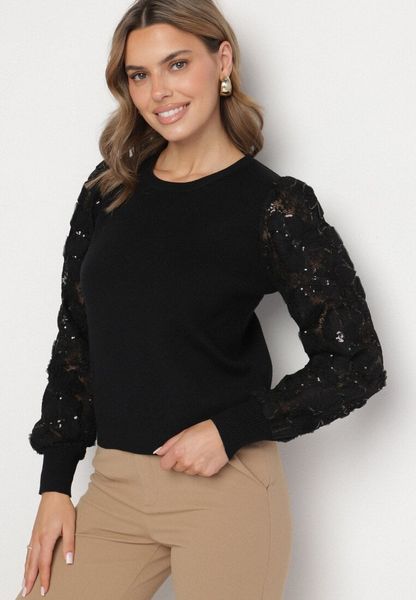 Czarny Sweter z Wiskozą z Ozdobnymi Koronkowymi Rękawami z Cekinami Tiliala