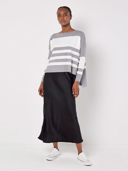 – dekolt: łódka- krój rękawów: nietoperz- dolny brzeg: z rozcięciem- krój: oversized- wzór: paski