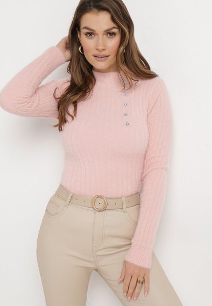 Jasnoróżowy Wełniany Sweter z Dłuższym Włosiem i Ozdobnymi Guzikami Avelio