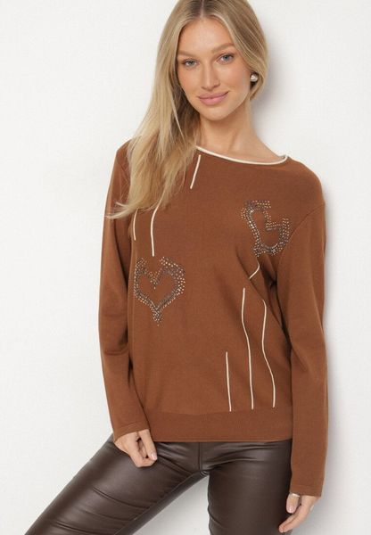 Brązowy Sweter Ozdobiony Sercami z Cyrkonii Unaressa
