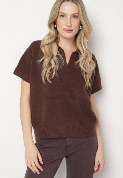 Brązowy Sweter z Wełną z Krótkim Rękawem i Kołnierzykiem Tevalina
