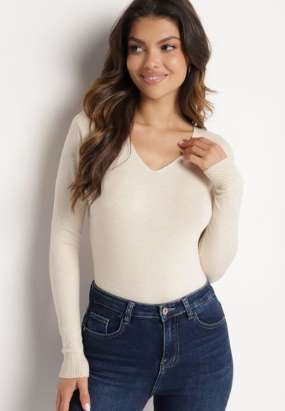 Jasnobeżowy Sweter z Bawełną i Dekoltem w Serek Etarevia