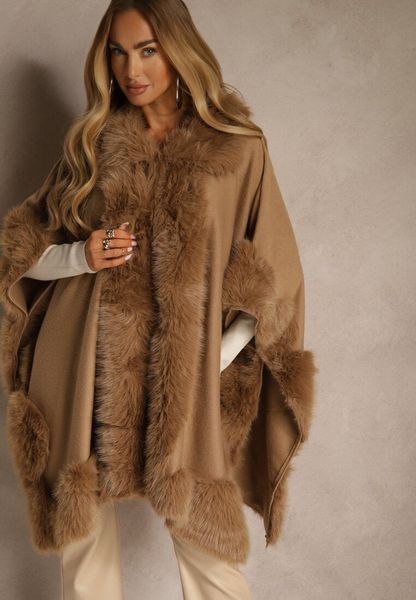 Jasnobrązowe Ponczo z Wiskozą Wełną i Futerkiem Mevicia