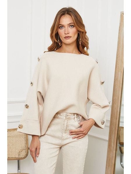 – dekolt: łódka- detale: ozdobne guziki- krój: luźny- look: jednokolorowy