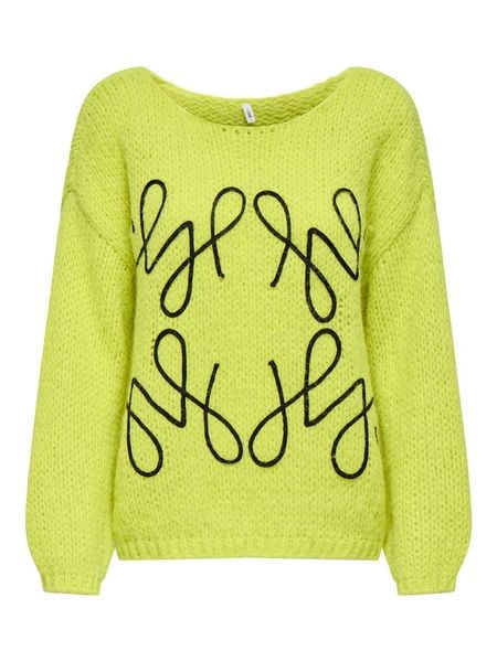 – dekolt: łódka- krój rękawów: bufiasty- detale: haft, nakładane rękawki- wzór splotu: ścisły- krój: luźny- look: jednokolorowy
