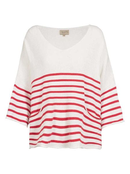 – dekolt: V- zrolowany brzeg: dolny, zakończenia rękawów- długość rękawa: 3/4- krój: prosty- wzór: paski