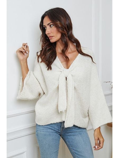 – z dodatkiem wełny- dekolt: okrągły- krój rękawów: rozszerzany do dołu- detale: ozdobne wiązanie- krój: luźny- look: jednokolorowy- wzór splotu: luźny