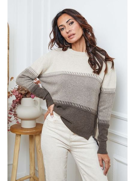 – z dodatkiem kaszmiru i wełny- dekolt: okrągły- ściągacz: dekolt, zakończenia rękawów, dolny brzeg- krój: prosty- wzór: colour blocking- wzór splotu: ścisły