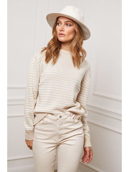 – z dodatkiem kaszmiru i wełny- dekolt: okrągły- ściągacz: dekolt, zakończenia rękawów, dolny brzeg- krój: prosty- wzór: paski- wzór splotu: ścisły