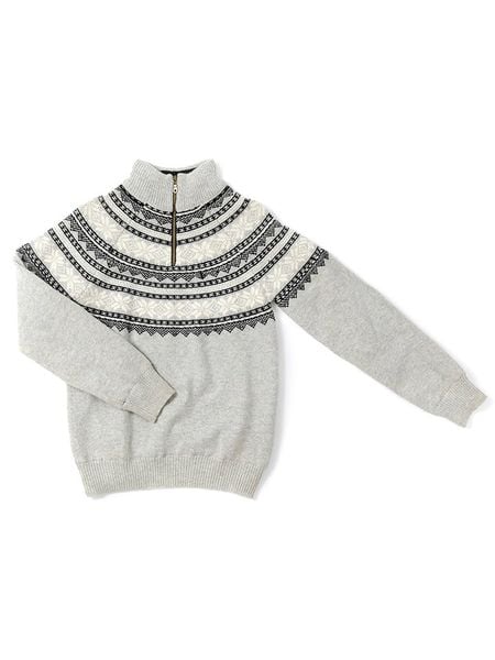 – z dodatkiem wełny- kołnierz: stójka- zapięcie: skrócony zamek błyskawiczny- ściągacz: kołnierz, zakończenia rękawów, dolny brzeg- wzór splotu: ścisły- krój: prosty- wzór: norweski
