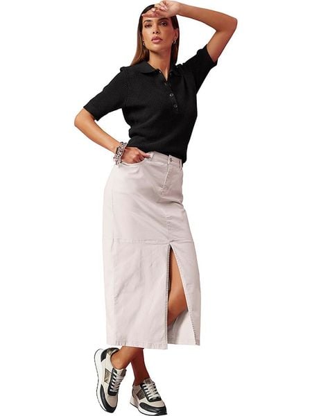 – kołnierzyk: polo- zapięcie: skrócona listwa guzikowa- długość rękawa: półdługi- ściągacz: zakończenia rękawów, dolny brzeg- krój: prosty- look: jednokolorowy