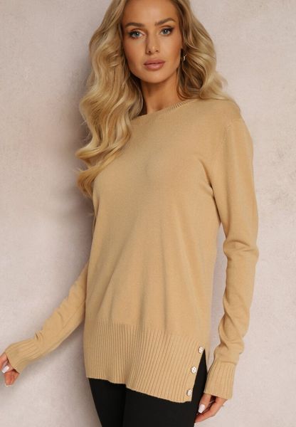 Beżowy Sweter z Dolnymi Rozcięciami i Ozdobnymi Guzikami Leomana