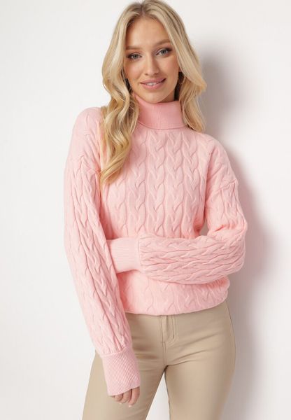 Różowy Sweter z Golfem w Warkoczowy Splot ze Ściągaczami Maraiwai