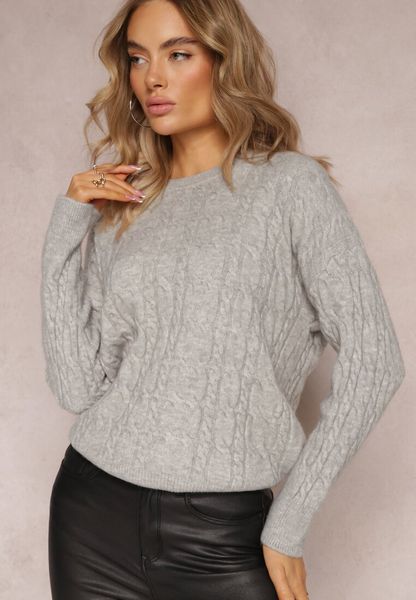 Szary Sweter z Okrągłym Dekoltem i Splotem w Warkocze Dawnitta