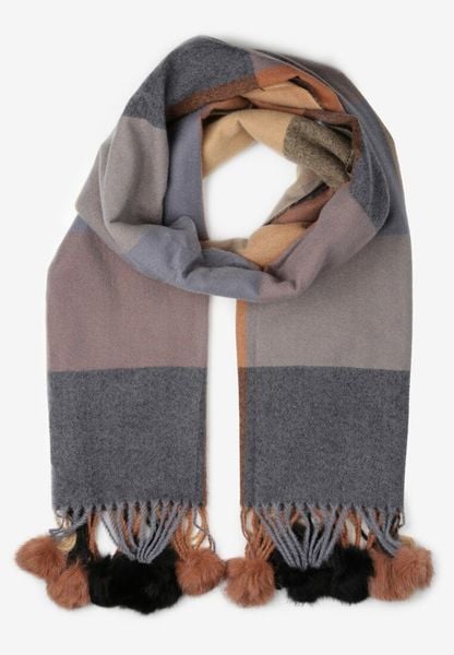 Szalik Komo wykonany z połączenia bawełny oraz wiskozy. Prostokątny fason w szeroką kratę, udekorowany kolorowymi pomponami na krótszych krawędziach.