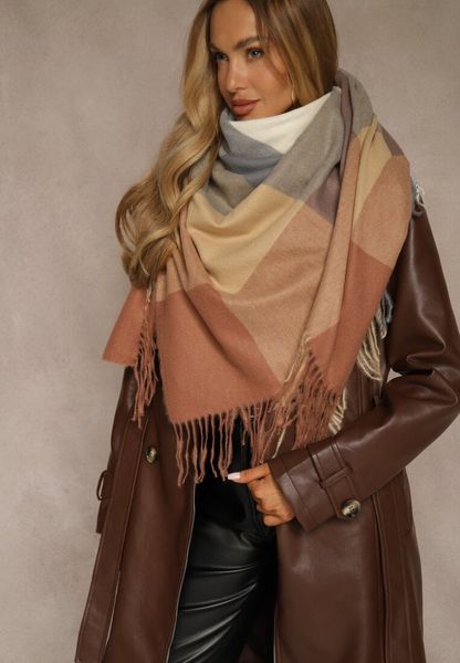 Szalik Saltorin zakończony frędzlami, o kwadratowym kształcie. Wykonany z połączenia wiskozy oraz bawełny, dekorowany printem w kratę. Będzie świetnie wyglądał na tle płaszcza lub kurtki w podobnym odcieniu. Otuli Cię przyjemnym ciepłem i ożywi stylizację.