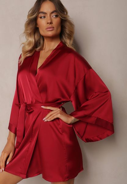 Bordowy Szlafrok z Satyny Wykończony Paskiem Rivathena