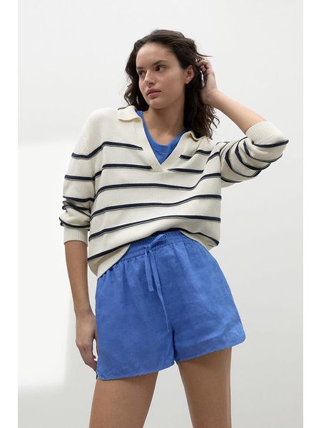 – czysty len- pas: ściągacz tunelowy- kieszenie: wpuszczane- krój: prosty- look: jednokolorowy