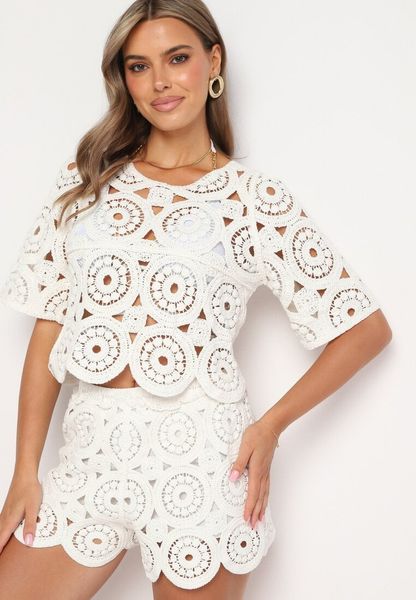 Białe Szorty z Dodatkiem Bawełny i Ażurowym Wzorem Wykończone Gumką w Pasie Dlitha