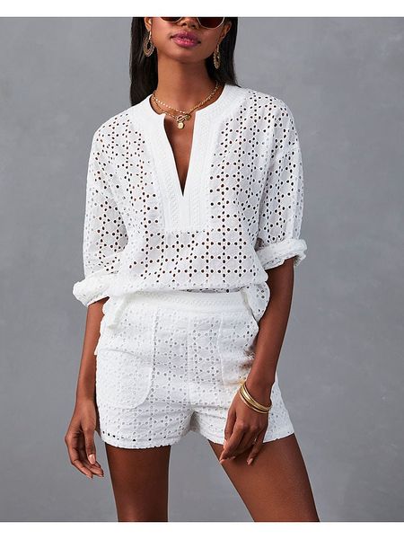 – dekolt: z rozcięciem- rękaw: bufiasty- zakończenie rękawów: guzik- krój: luźny- wzór: dziurkowany- wykończenie: delikatnie prześwitująceUwaga: Przy wyborze właściwego wariantu zaleca się korzystanie z tabeli rozmiarów.
