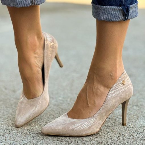 Złote skórzane Polskie szpilki damskie Prestige 2106 Zamsz