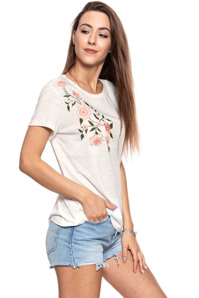 Damska koszulka z krótkim rękawem w beżowym kolorze. Charakteryzuje ją regularny krój, motyw kwiatów oraz okrągły dekolt.