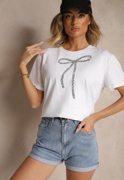 Biały Bawełniany T-shirt z Cekinową Aplikacją w Kształcie Kokardy Tenuria