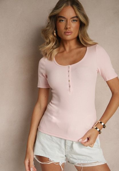 Różowy Bawełniany T-shirt Prążkowany z Guzikami Florvivi