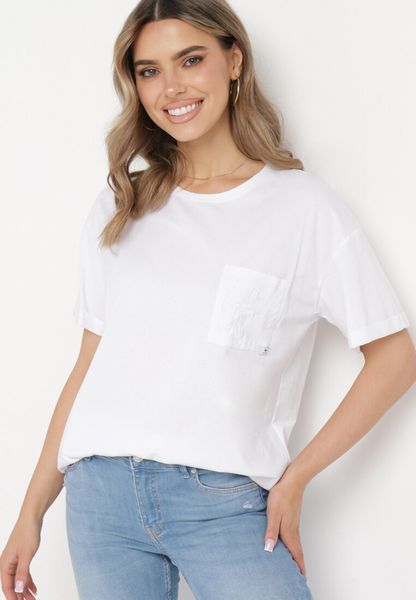 Biały Bawełniany T-shirt o Klasycznym Fasonie z Kieszonką Asettia
