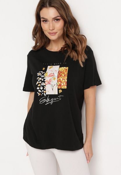 Czarny Bawełniany T-shirt z Ozdobnym Nadrukiem Jalliana