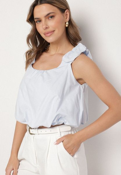 Jasnoniebieski Bufiasty Top z Bawełny na Ramiączkach z Marszczeniem Sepoliva