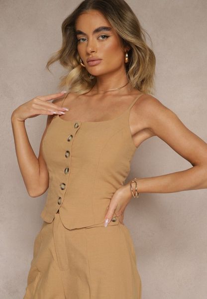 Ciemnobeżowy Top Zapinany na Guziki z Bawełną na Cienkich Ramiączkach Divilna