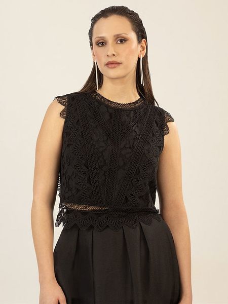 – ramiączka: szerokie- dekolt: okrągły- zapięcie: suwak z tyłu- detale: koronka- krój: cropped- look: jednokolorowy