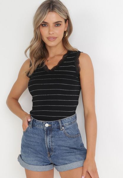 Top Hachinobu bez rękawów z ozdobnymi wstawkami z koronki przy ramionach. Wykonany z prążkowanej wiskozy z metaliczną nitką. Idealny top do jeansów czy szortów.