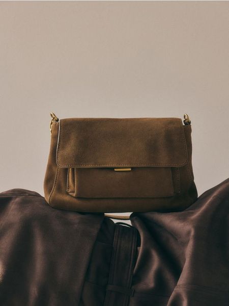 Torebka o prostym kształcie, wykonana z naturalnego zamszu.