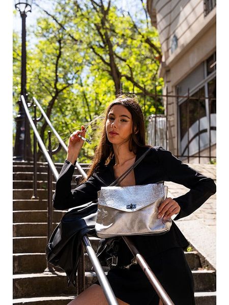 – materiał: skóra- powierzchnia: z metalicznym połyskiem- długi pasek przez ramię: łańcuszek- zapięcie: przekręcane, suwak- kieszenie wewnętrzne: 1 kieszeń na zamek- tekstylna podszewka: tak- wyprodukowano we Włoszech