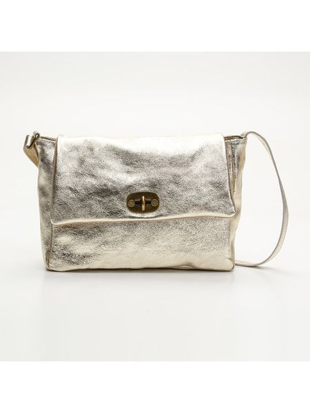– materiał: skóra- powierzchnia: z metalicznym połyskiem- długi pasek przez ramię: regulowany- zapięcie: przekręcane, suwak- kieszenie wewnętrzne: 1 kieszeń na zamek- tekstylna podszewka: tak- wyprodukowano we Włoszech