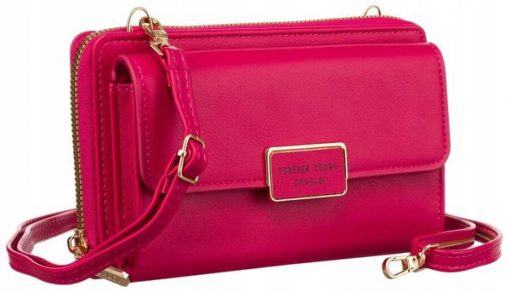 Torebko-portfel z wysokiej jakości skóry eko. W tym modelu znajdują się przegródki na karty płatnicze lub dokumenty wielkości karty. Z przodu kieszonka na telefon zapinana na zatrzask. Torebka wyposażona w długi odpinany pasek.