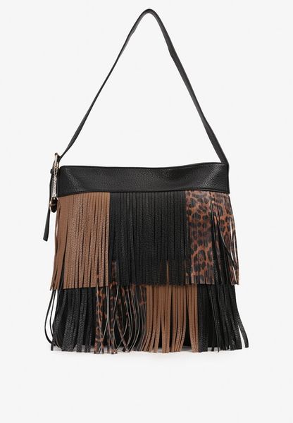 Czarno-Brązowa Kwadratowa Torebka Listonoszka z Ozdobnymi Frędzlami w Panterkę Ravalanna